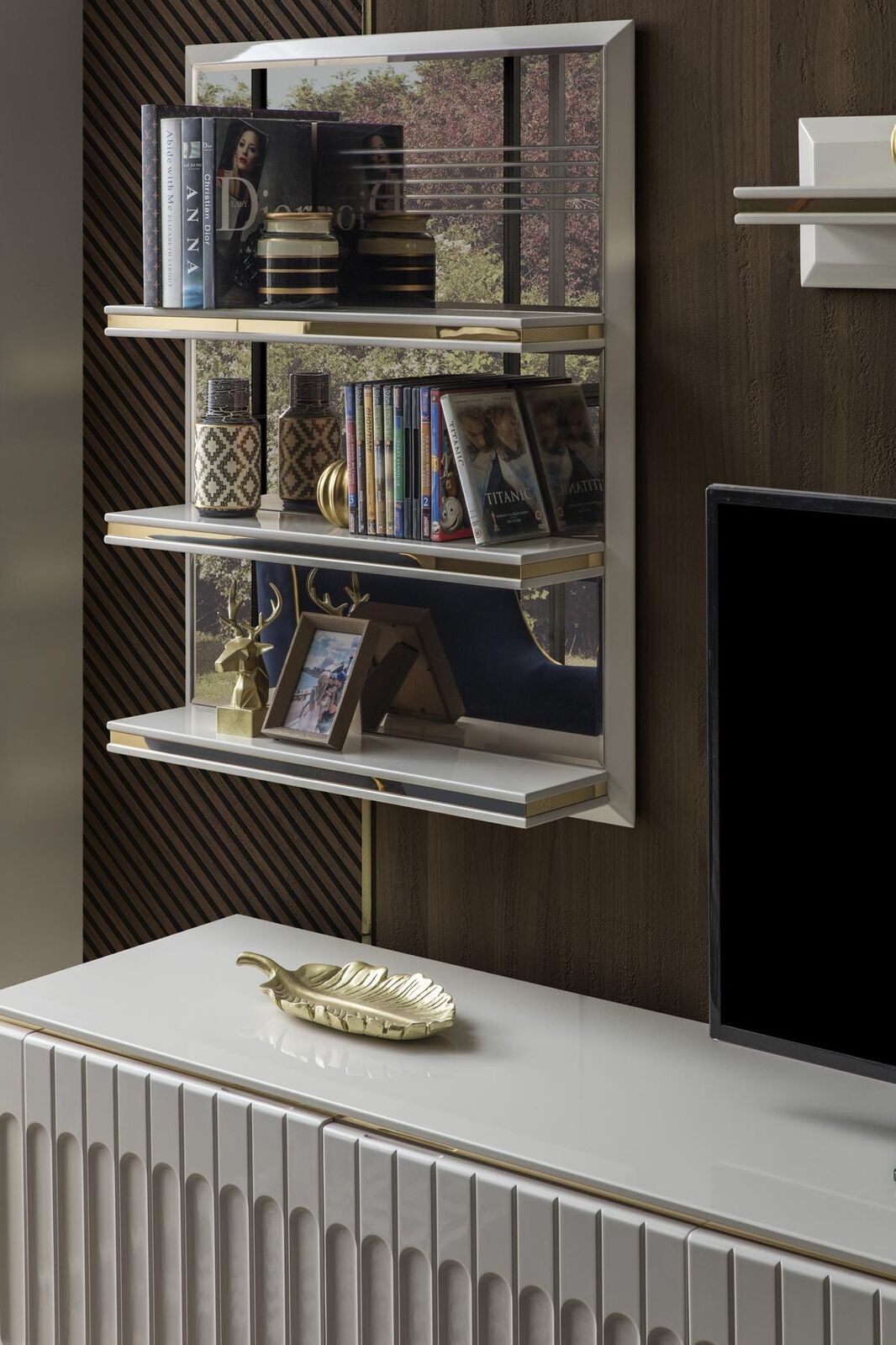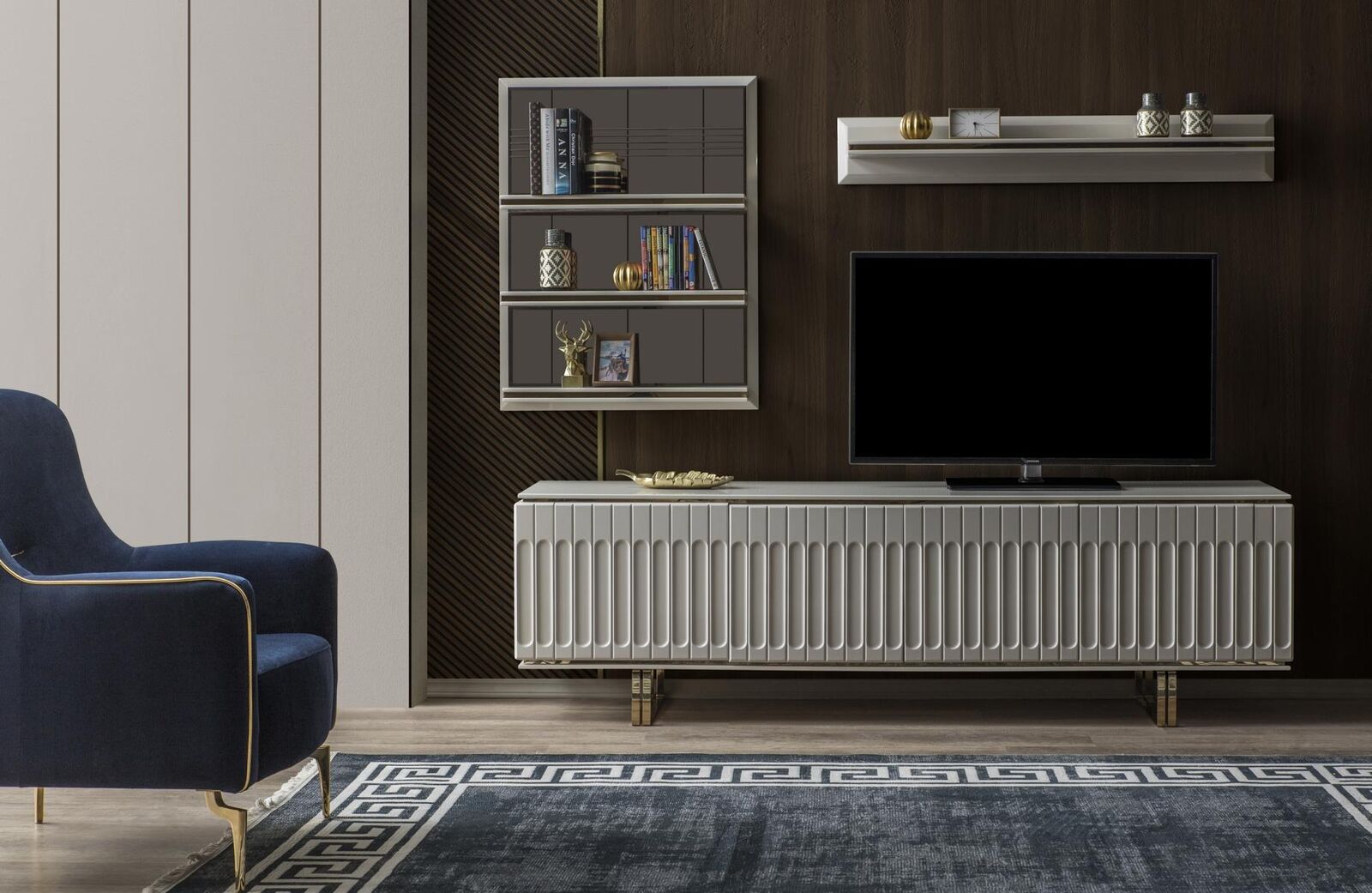 Изделие также включает в себя секцию стеллажей и шкаф для хранения, что позволяет держать ваш гостиной пространство в порядке. Встроенная система хранения выполнена с размерами около 130 см в длину, 14 см в ширину и 21 см в высоту, обеспечивая достаточно места для книг, аксессуаров и других нужных вещей. Такая конструкция позволяет легко и быстро разместить телевизор и медиа устройства, создавая уютную зону отдыха для всей семьи. Цвет, как показано на изображении, дополняет большинство интерьеров, делая вашу гостиную еще более комфортной и стильной.