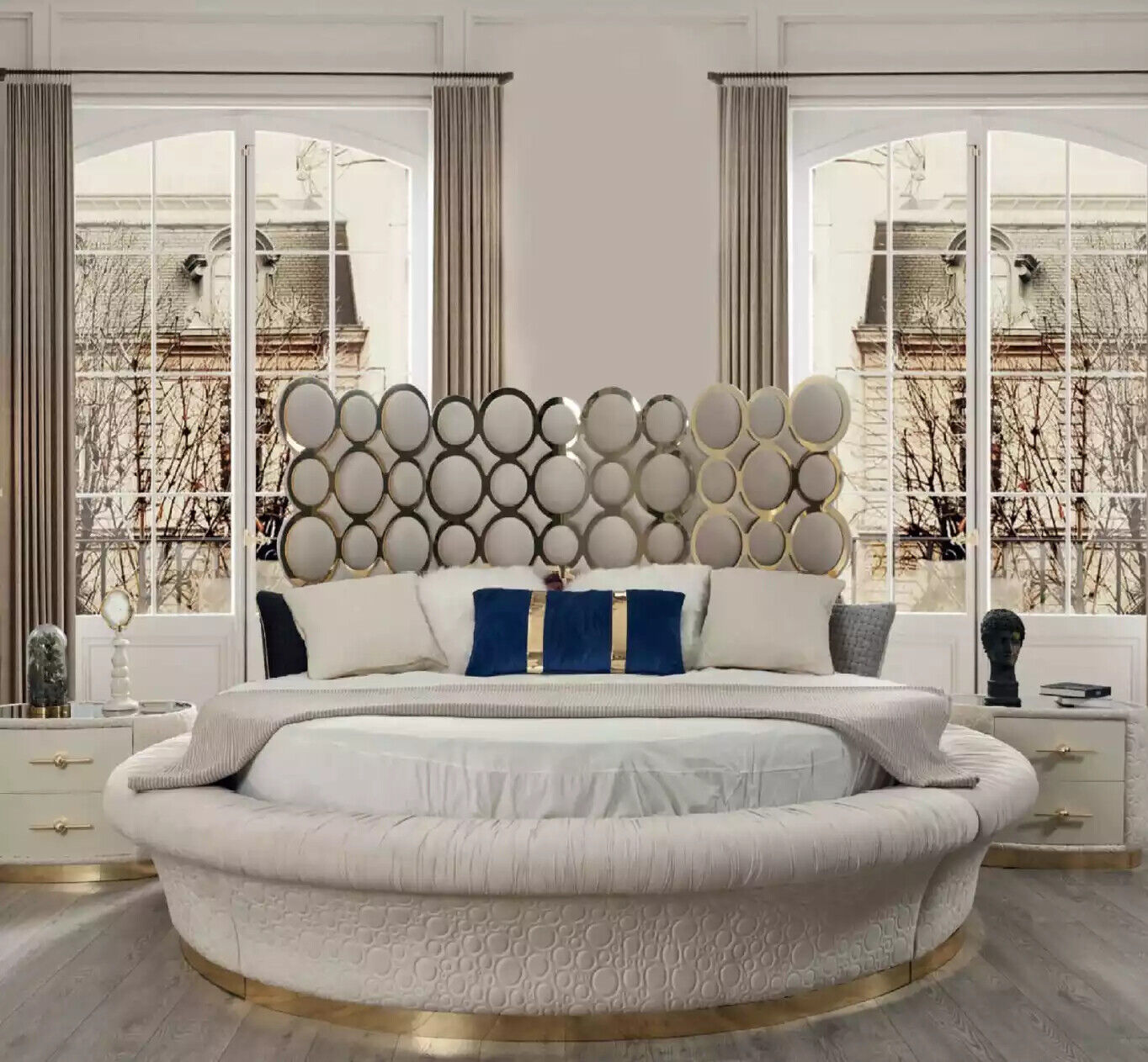Представляем вам Современный комплект спальни: кровать + 2 прикроватные тумбочки + туалетный столик + зеркало, 5 предметов, который станет великолепным дополнением к вашему интерьеру. Этот комплект включает в себя просторную кровать с размерами спального места 220 x 220 см, идеально подходящую для комфортного отдыха. Две стильные прикроватные тумбочки размером 86 x 55 x 45 см обеспечат удобное хранение всех необходимых мелочей. Элегантный туалетный столик размерами 220 x 50 x 74 см дополнен изящным зеркалом, создавая идеальное пространство для утренних сборов. Выполненный из прочного дерева и текстиля, этот комплект привнесет в ваш дом уют и современный стиль.