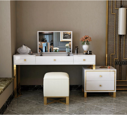 Этот новый набор из 3 предметов для спальни идеально подходит для создания уютной зоны ухода за собой. Туалетный столик может использоваться как место для ежедневного макияжа или укладки волос, а также для хранения косметики и аксессуаров. Зеркало позволит вам делать макияж и прически с комфортом, а стильный табурет обеспечит удобство во время процедур. Этот туалетный столик станет вашим верным помощником в утренних ритуалах, даря удовольствие от использования и радуя глаз своим прекрасным дизайном.
