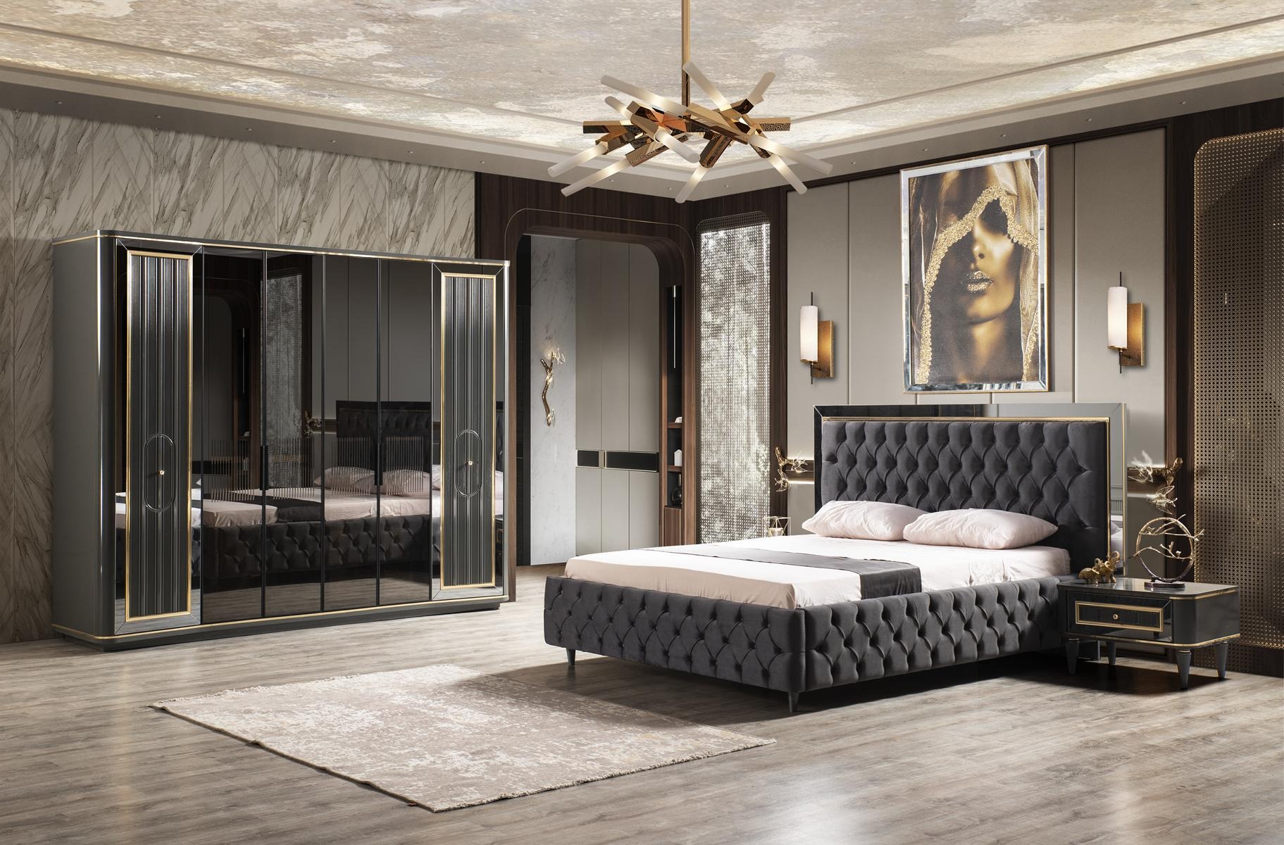 Спальня: дизайн кровати в современном стиле, роскошные кровати 2 шт., 2 тумбочки, гардероб 4 предмета.