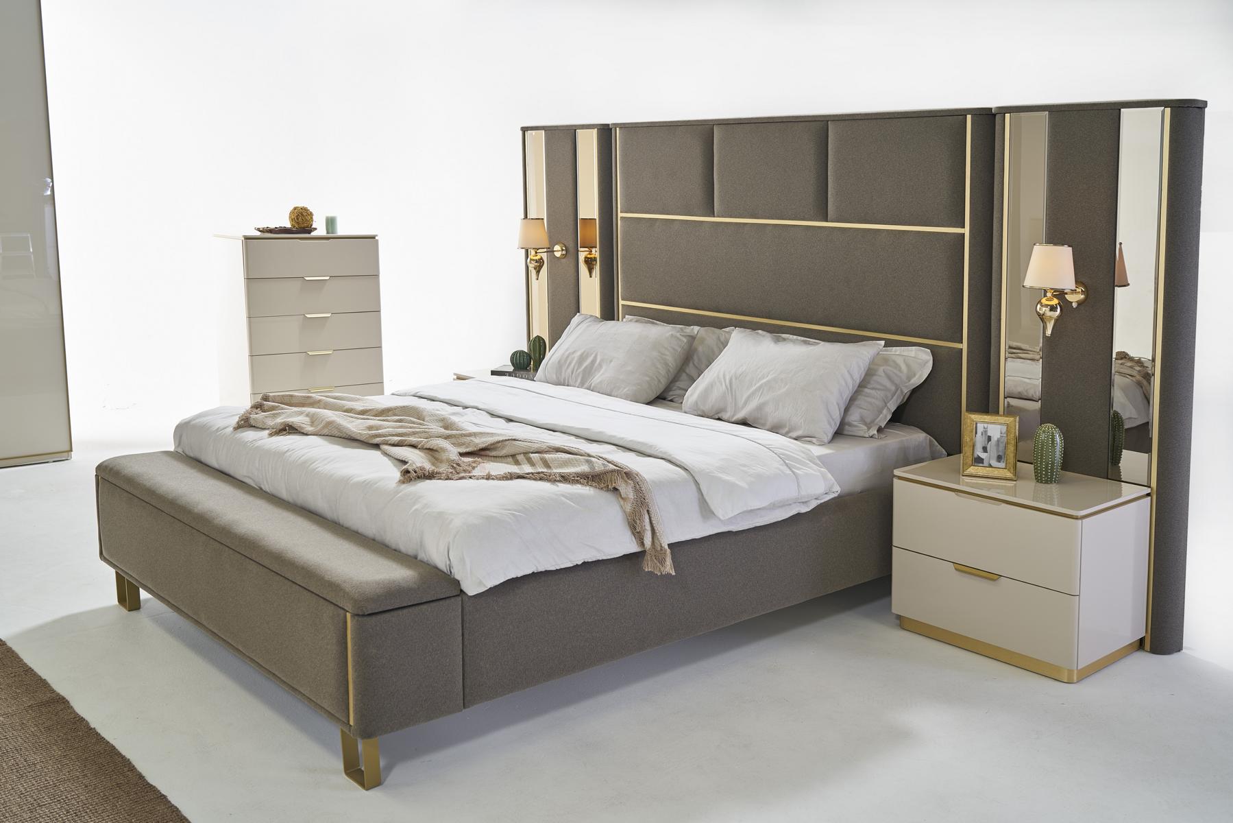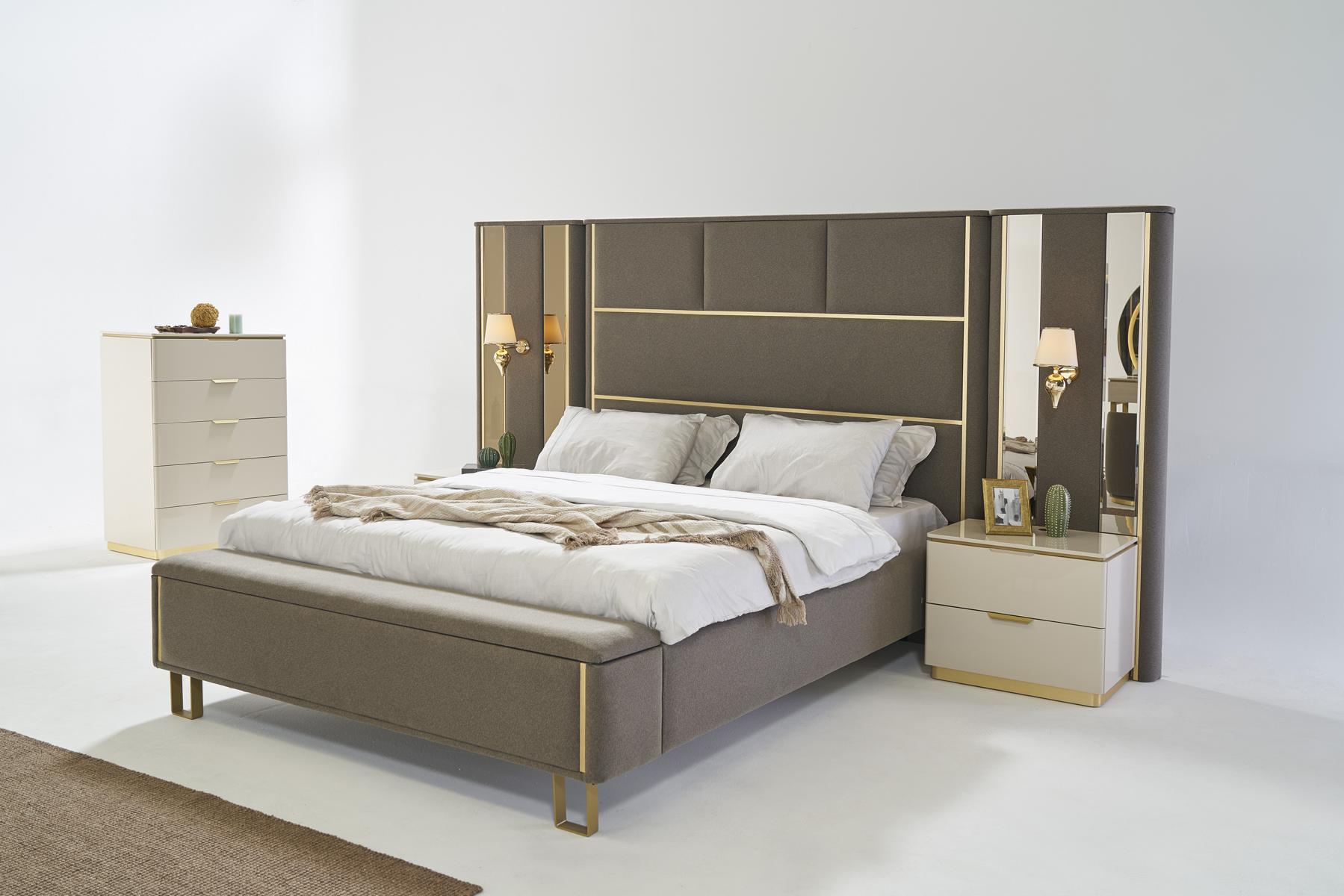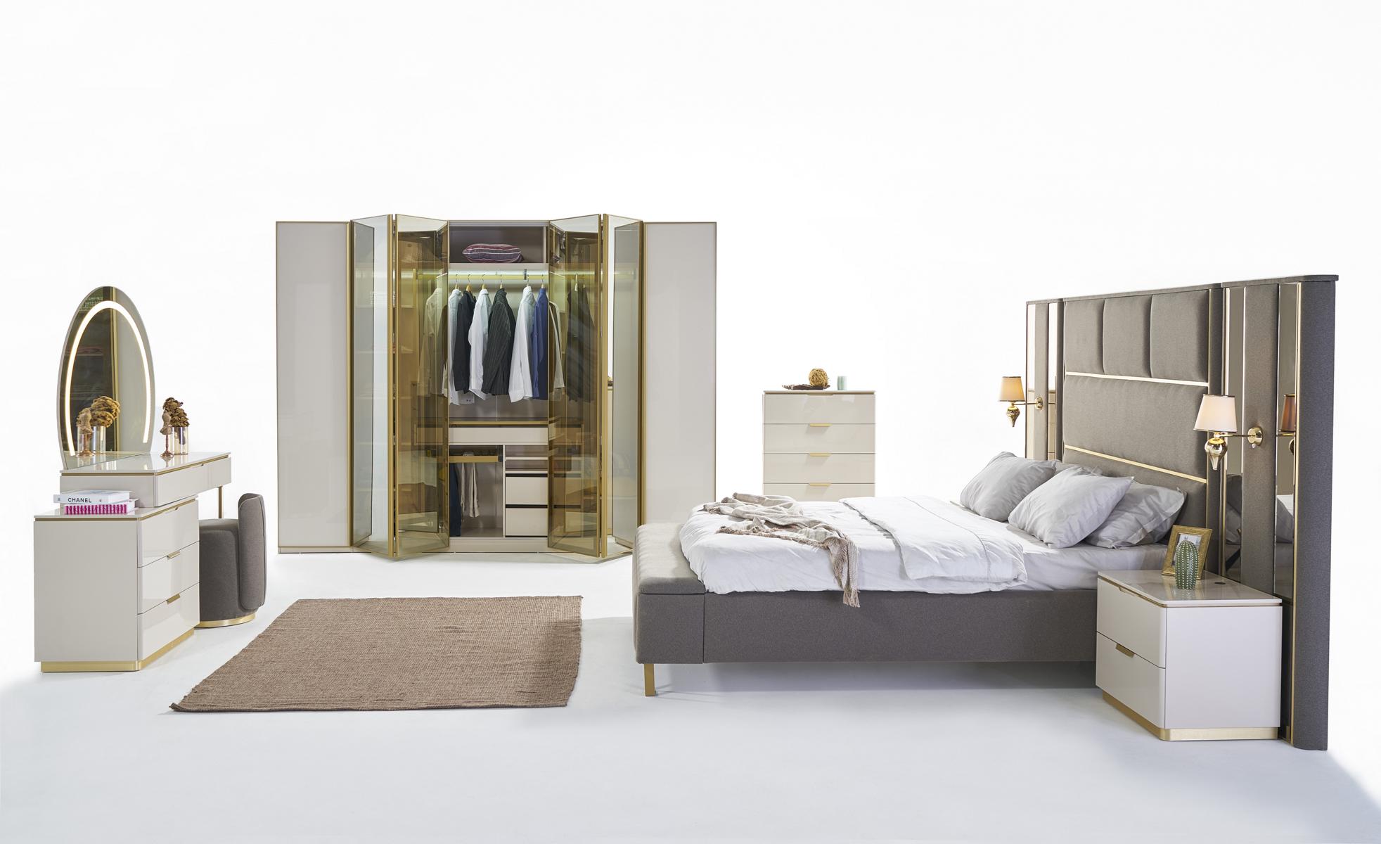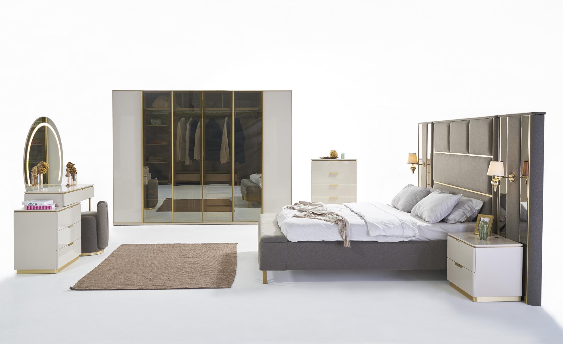 Этот роскошный набор спальни идеально подойдет для тех, кто ценит стиль, качество и комфорт. Замечательное сочетание элементов позволит вам создать уютное пространство для отдыха и хранения вещей. Расположите настенное панно над ночными столиками для добавления эстетической глубины или используйте туалетный столик и зеркало для создания уединенного места утреннего макияжа. Наслаждайтесь функциональностью шкафа и комода для удобного размещения вашей одежды и личных вещей. Воплотите свои мечты о идеальной спальне с этим элитным набором мебели.