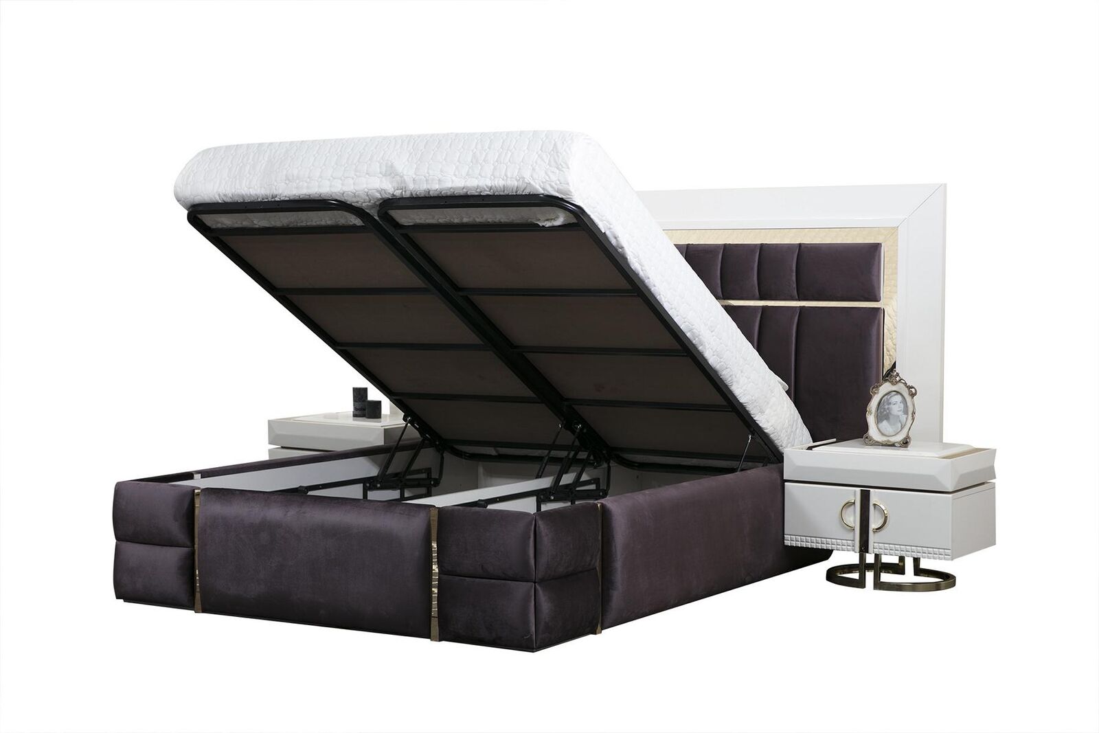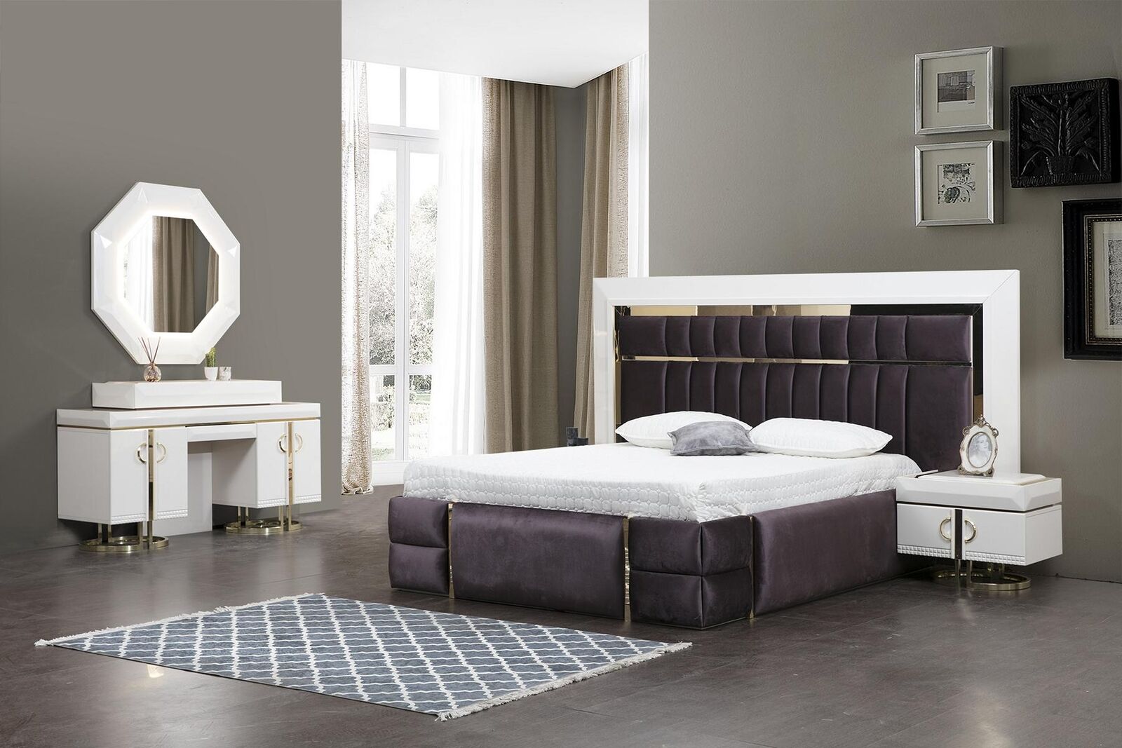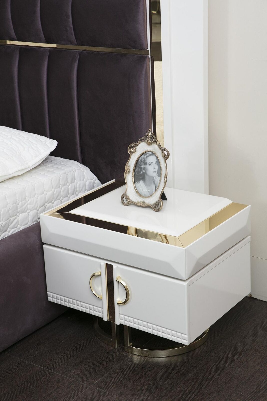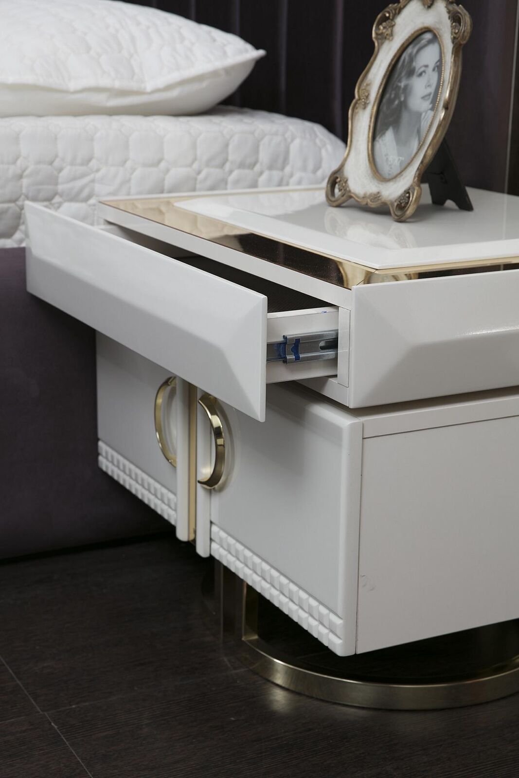 Красивый комплект для спальни из 4 предметов в современном стиле и молочно-белом исполнении.