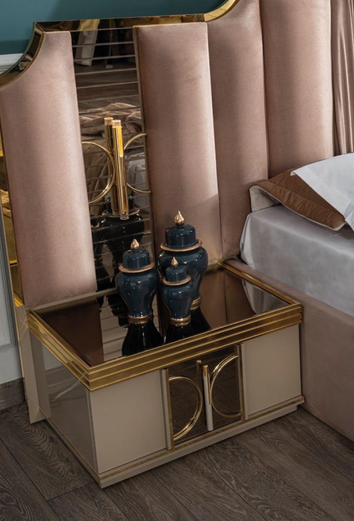 Набор для спальни в современном стиле - двуспальная кровать, два прикроватных столика, комод с зеркалом.