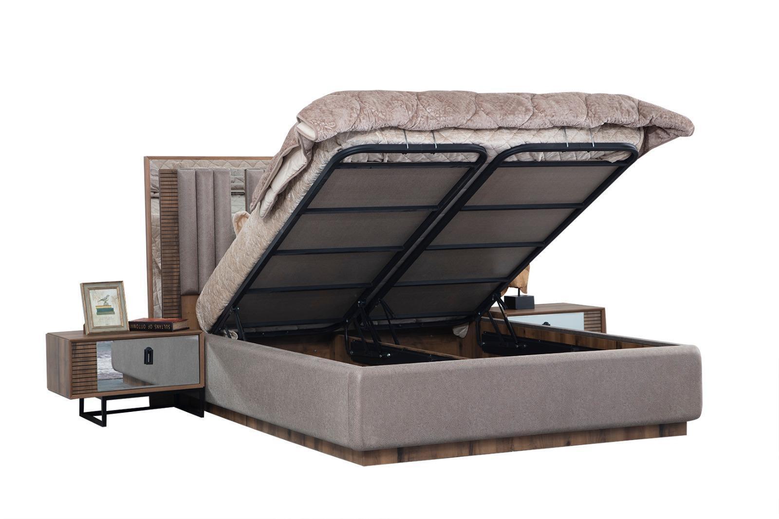 Стильный современный спальный гарнитур с элегантной кроватью, прикроватными тумбочками и комодом в коричневом цвете.