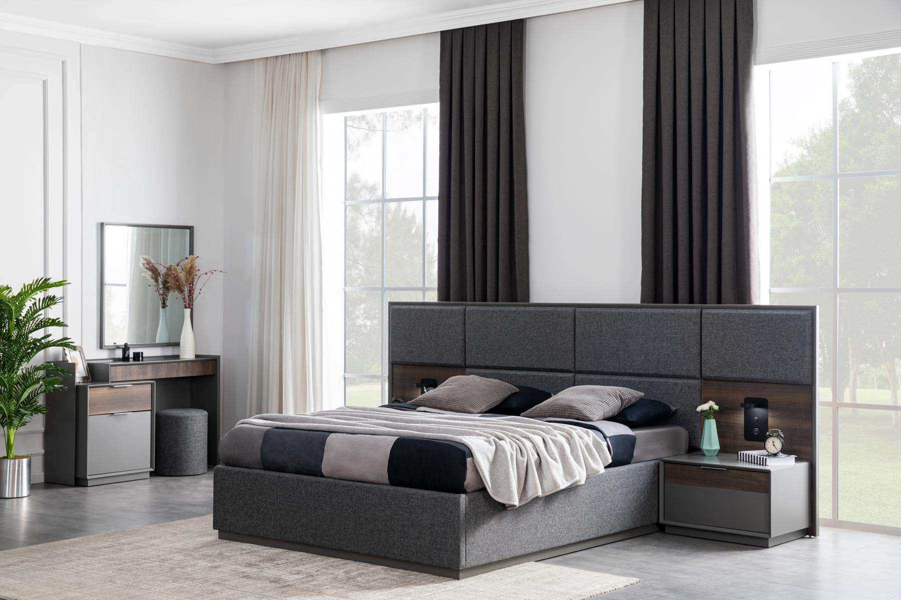 Спальня Кровать 2x Прикроватный столик Комплект Постельного белья с USB-светом Лофт - это элегантный и удобный комплект мебели для спальни, который станет идеальным дополнением к вашему интерьеру. Комплект включает в себя стильную кровать с уютным спальным местом размером 180 x 200 см, а также два прикроватных столика для удобного хранения предметов первой необходимости. Материал изготовления - дерево с текстильными элементами, обеспечивает прочность и долговечность изделий. К тому же, на прикроватных столиках предусмотрено USB-подключение для удобной зарядки устройств прямо возле кровати.