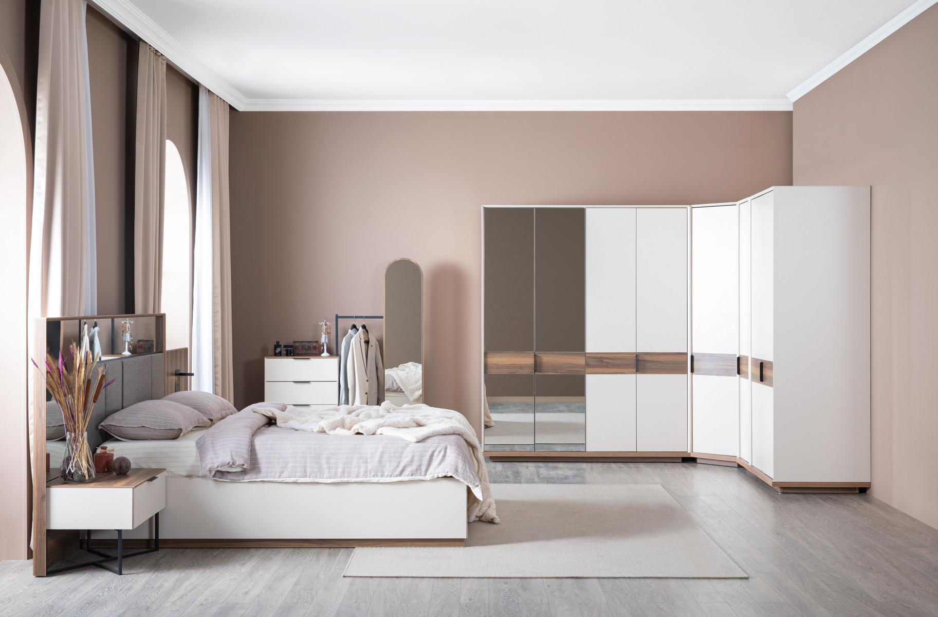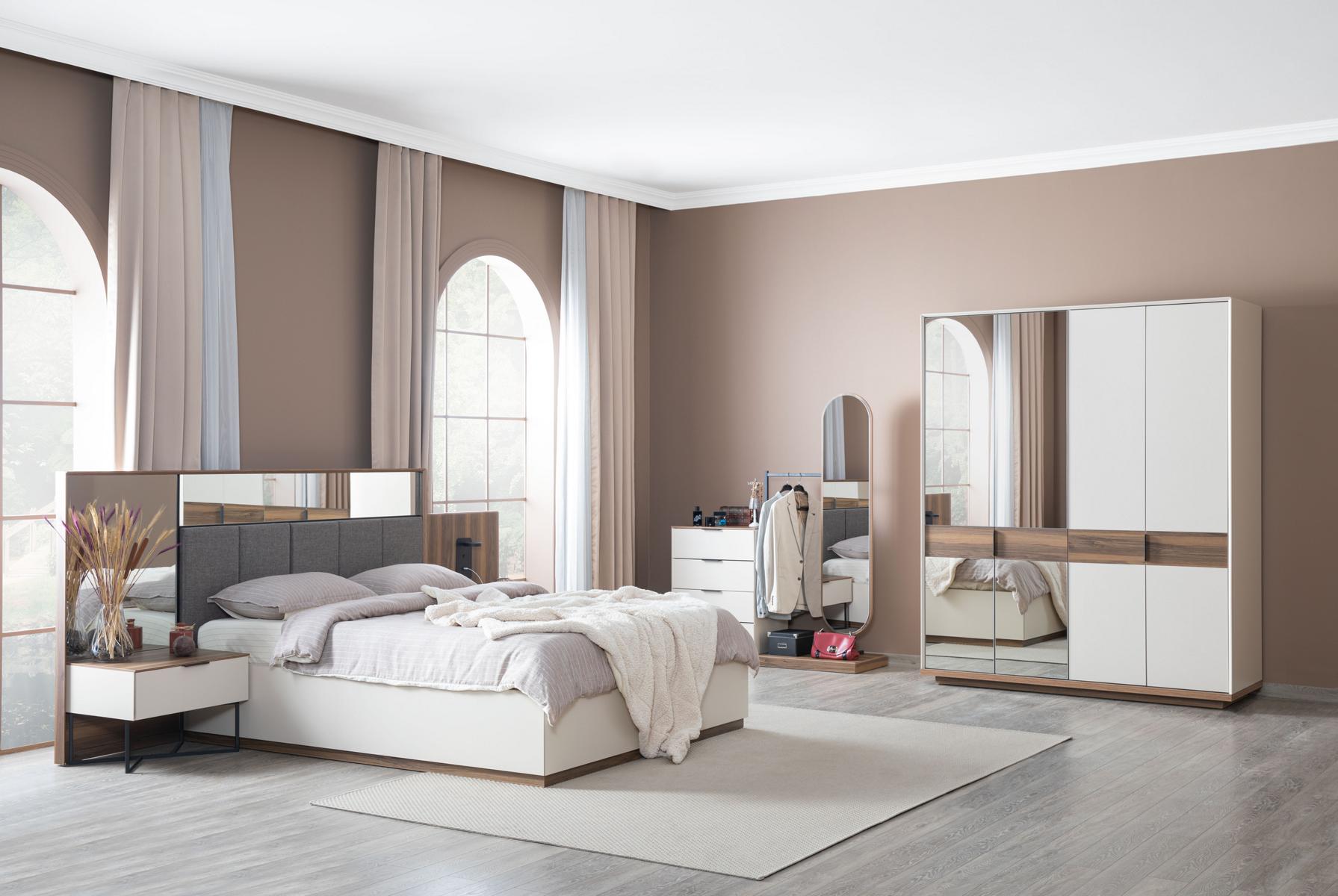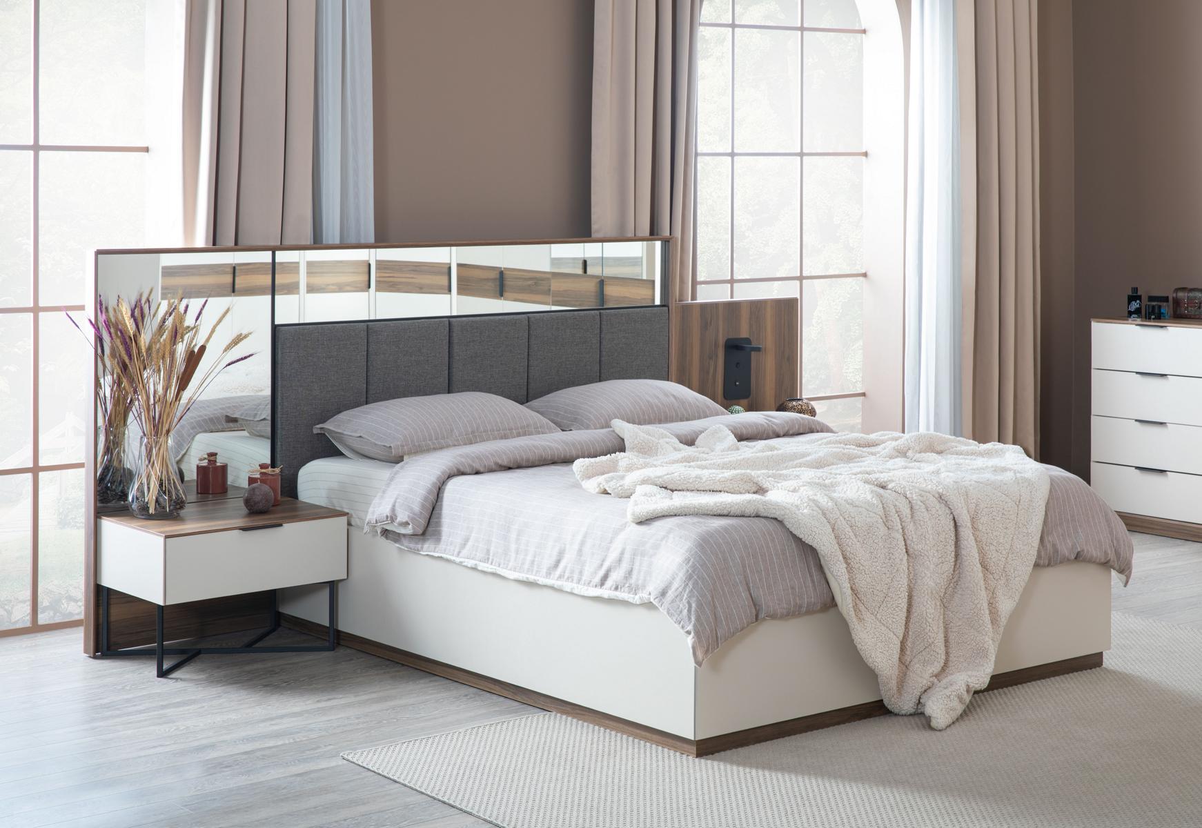 Набор кровать 2x, две тумбочки 4шт., полностью новая роскошная спальня мебель - это идеальное решение для создания роскошного и уютного интерьера спальни. Включает в себя двуспальную кровать с rozměry 302 x 212 x 126 см, обеспечивающую комфортный отдых размерами спального места 180 х 200 см. В комплекте также имеются два стильных ночных столика размерами 63 x 46 x 44 см и комод с зеркалом с выразительным дизайном размером 138 x 48 x 172 см. Изготовленный из высококачественного дерева, текстиля и стекла, этот набор обещает долговечность и элегантность в вашем интерьере.