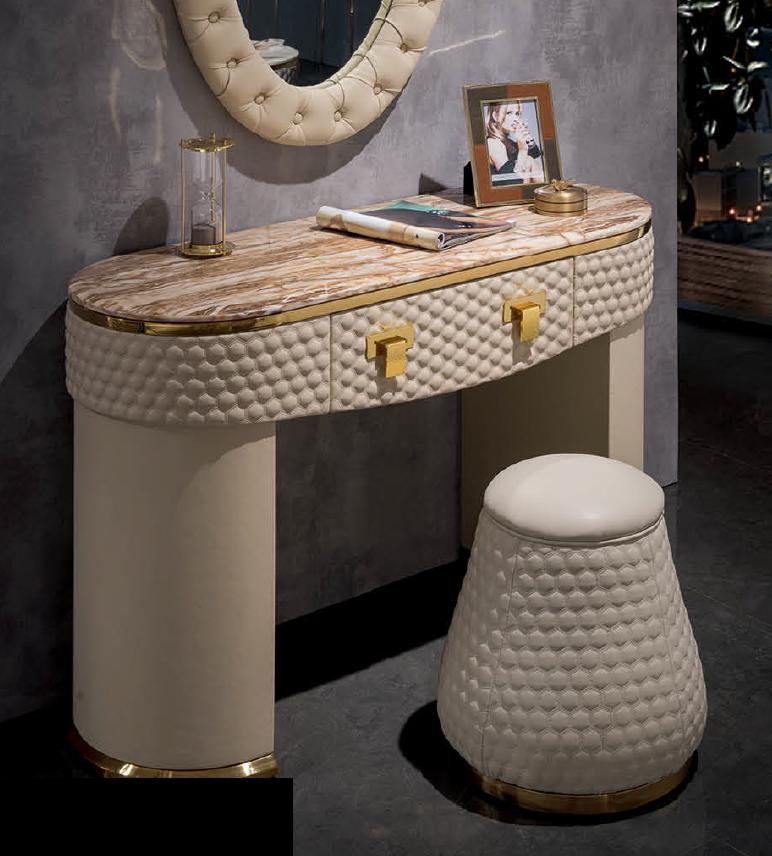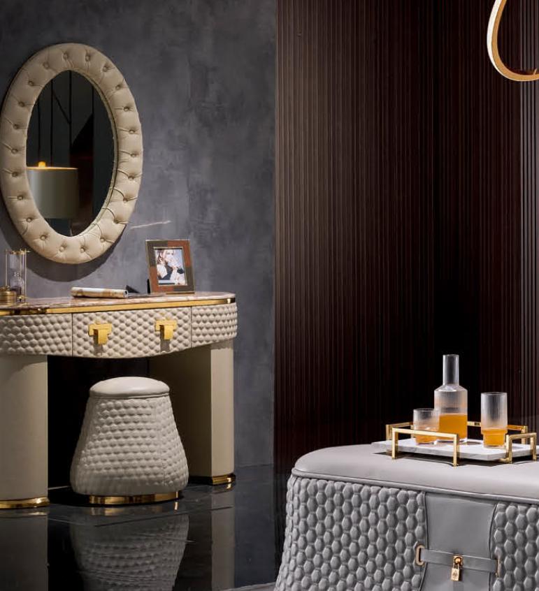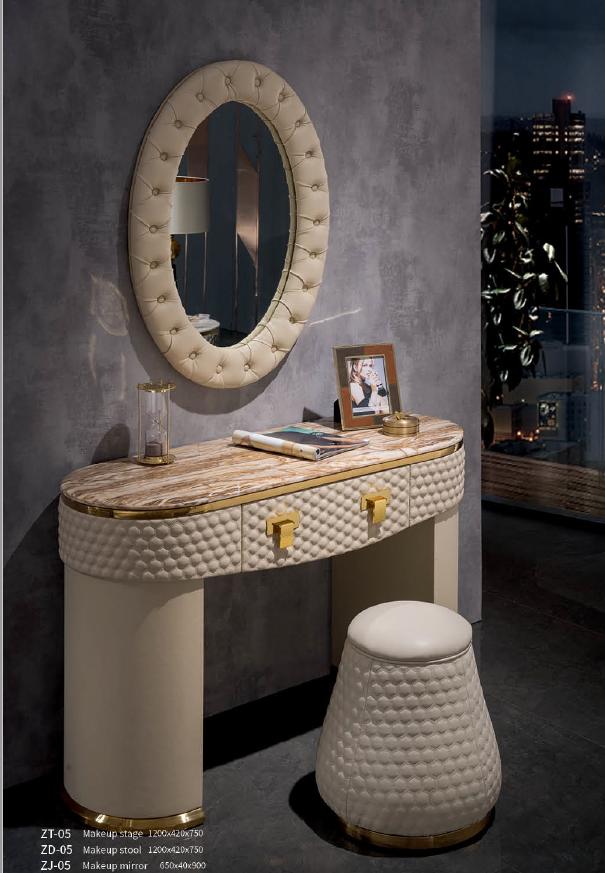 Создайте уютный уголок для ухода за собой и придайте стиль вашей спальне с помощью этого полного комплекта. Натуральная кожа обеспечит комфорт и прочность, а внутренний каркас из натурального дерева придаст долговечность и надежность каждому элементу. Разместите этот компактный комплект в удобном месте, чтобы иметь всё необходимое под рукой во время утреннего макияжа или ухода за кожей лица. Независимо от вашего цветового решения интерьера, туалетный столик Зеркало Табурет Полный комплект Комод Спальня Новый станет функциональным и стильным дополнением вашего дома.