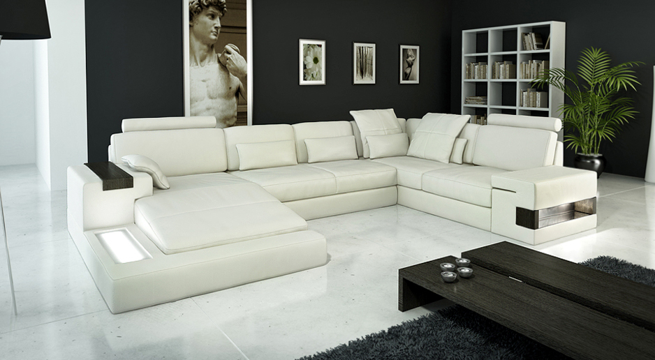 Кожаный диван USB дизайн-диван У-образный уклона диван-угловой новый светодиодный - это идеальное сочетание комфорта, стиля и функциональности. Изготовленный из премиум кожаного волокнистого материала (70% кожа / 30% полиэстер), этот диван не только привлекает внимание своим уникальным дизайном У-образной формы и светодиодной подсветкой с пультом дистанционного управления, но и предлагает USB-клик-автомат с тройным разъемом для удобной зарядки устройств. Высокий уровень комфорта достигается благодаря регулируемой спинке, глубокому сидению и высокому качеству материалов.